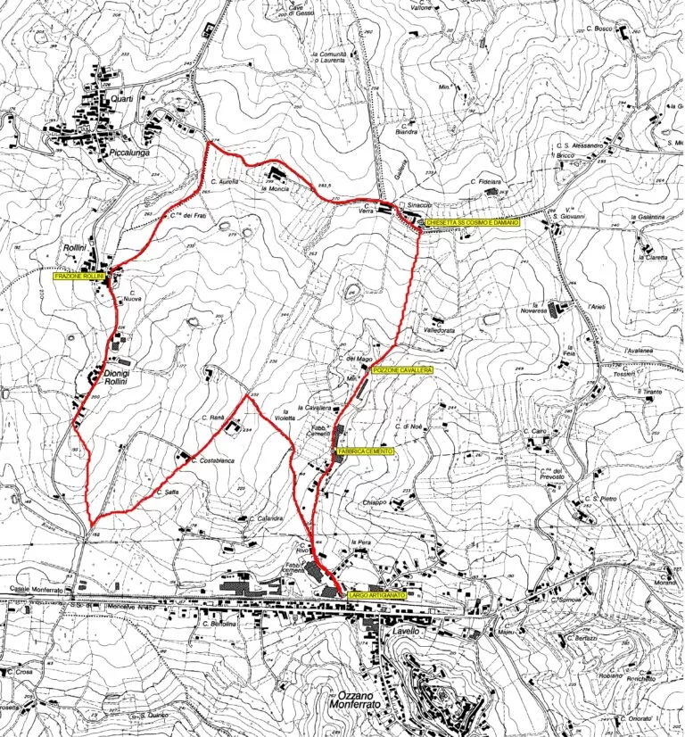 Al bivio successivo il percorso svolta a sinistra e scende verso la frazione Rollini, offrendo altri panorami di Ozzano e delle colline della Val Cerrina; si prosegue nel fondovalle ricongiungendosi a Via Fontanola e ritornando in breve al Largo Artigianato, dove era partito l’itinerario.