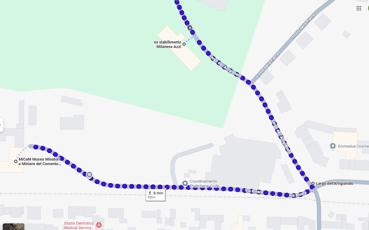 Da Largo Artigianato, si costeggia la struttura dell’ex Cementificio Milanese Azzi, poi si prende via Fontanola.