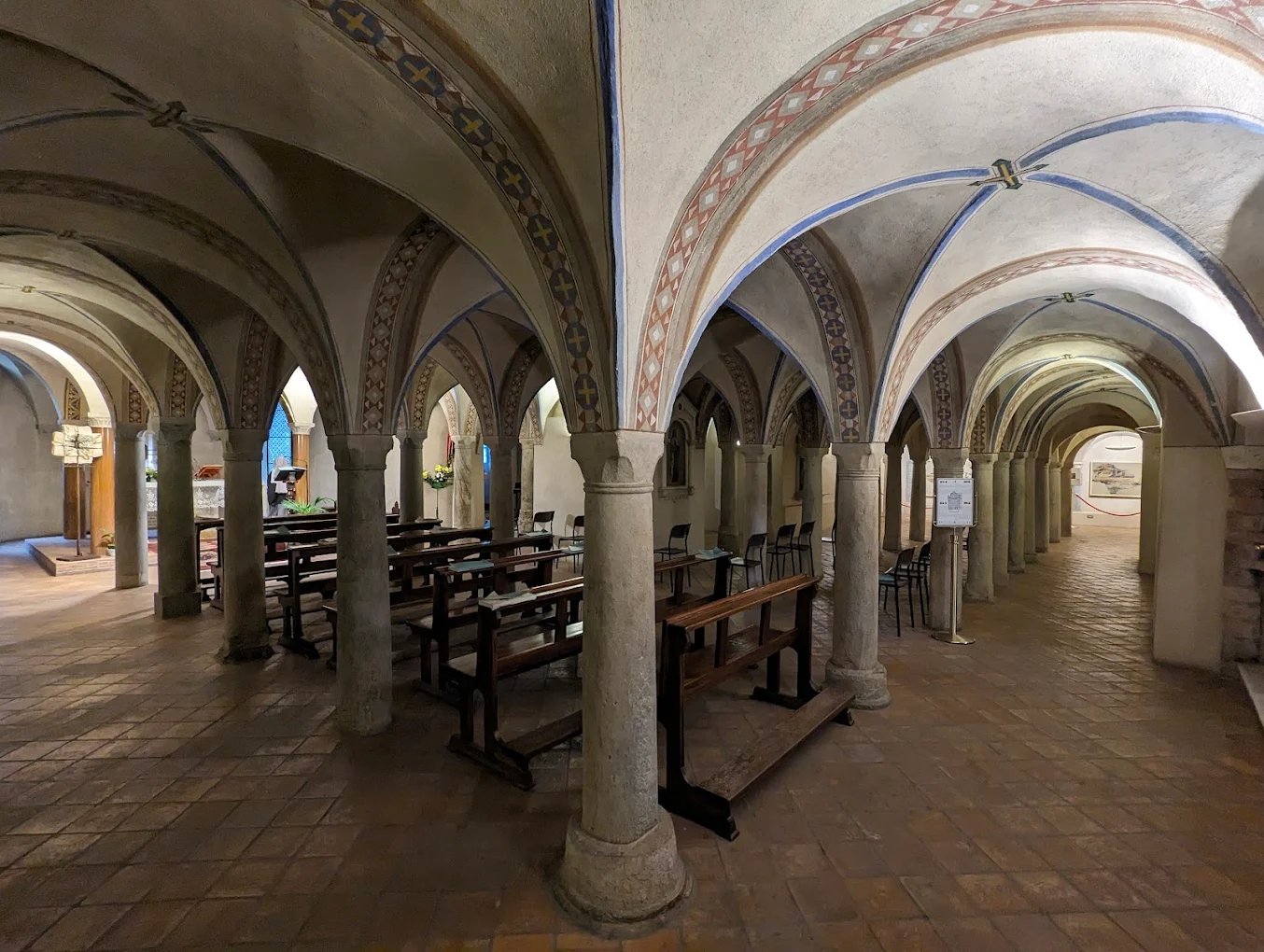 Sotto il presbiterio si trova la cripta del secolo XI, con un corpo longitudinale triabsidato e uno trasversale monoabsidato ciascuno suddiviso in tre navatelle da ben 98 colonnine in marmo. Nel braccio destro il sarcofago del Vescovo Guido morto nel 1070.