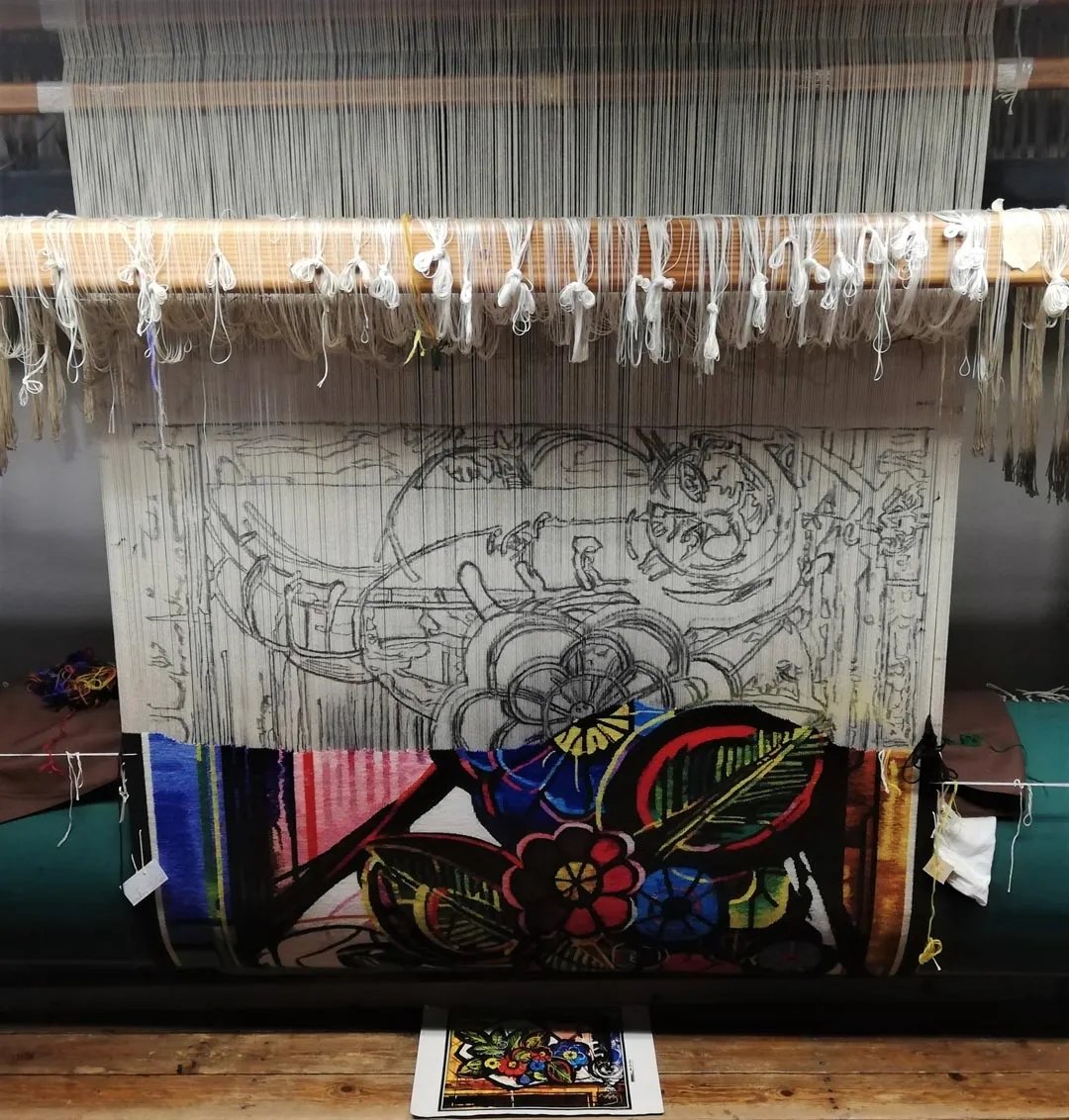 Il bozzetto del disegno dell’arazzo viene proiettato sui fili dell’ordito e qui riportato con un segno indelebile. La precisa aderenza al modello e ai suoi colori è incombenza delle esperte tessitrici sotto la supervisione dell’arazziere.