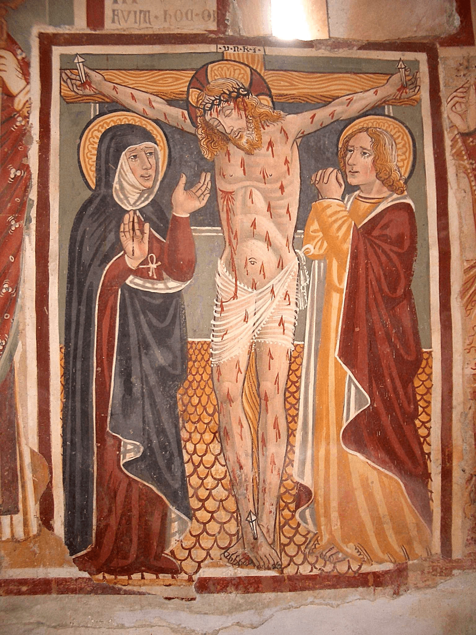 Sulla parete destra si trovano due “Crocifissioni” del 1403 e del 1482.