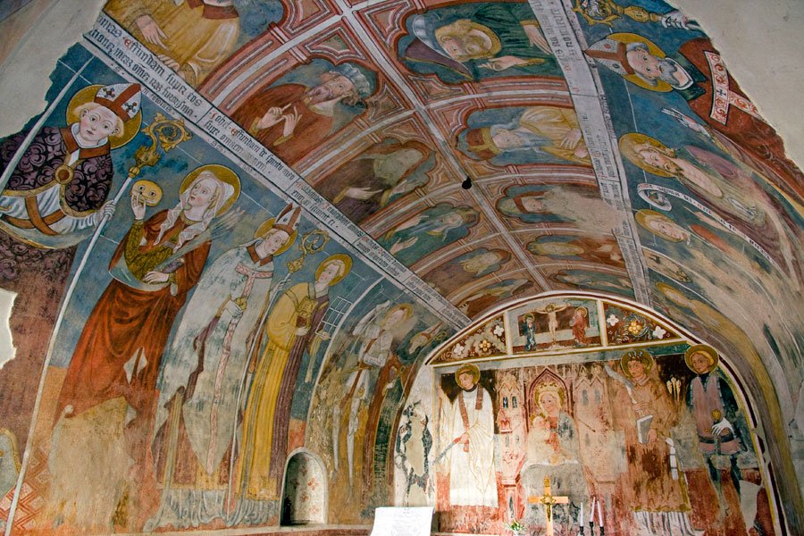 Un’iscrizione gotica, su cui spicca un’aquila dei Tornelli, indica che gli affreschi furono commissionati ad uno o più “magistris pictoribus“.