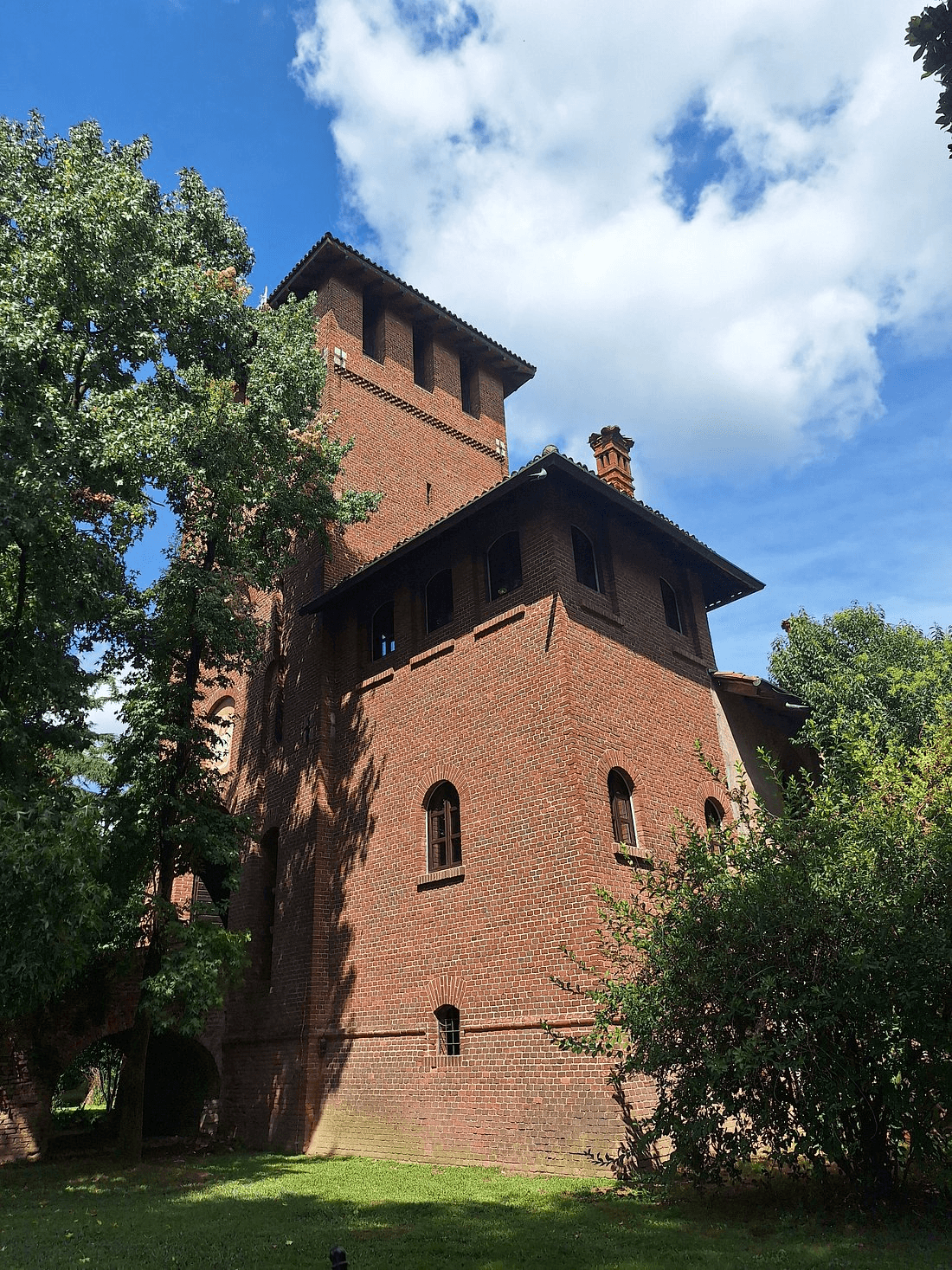 Dell’antico Castello di Morghengo, entro un ampio parco, recintato da muretto, si innalza un torrione quadrangolare sormontato da una robusta merlatura su cui poggia direttamente il tetto.