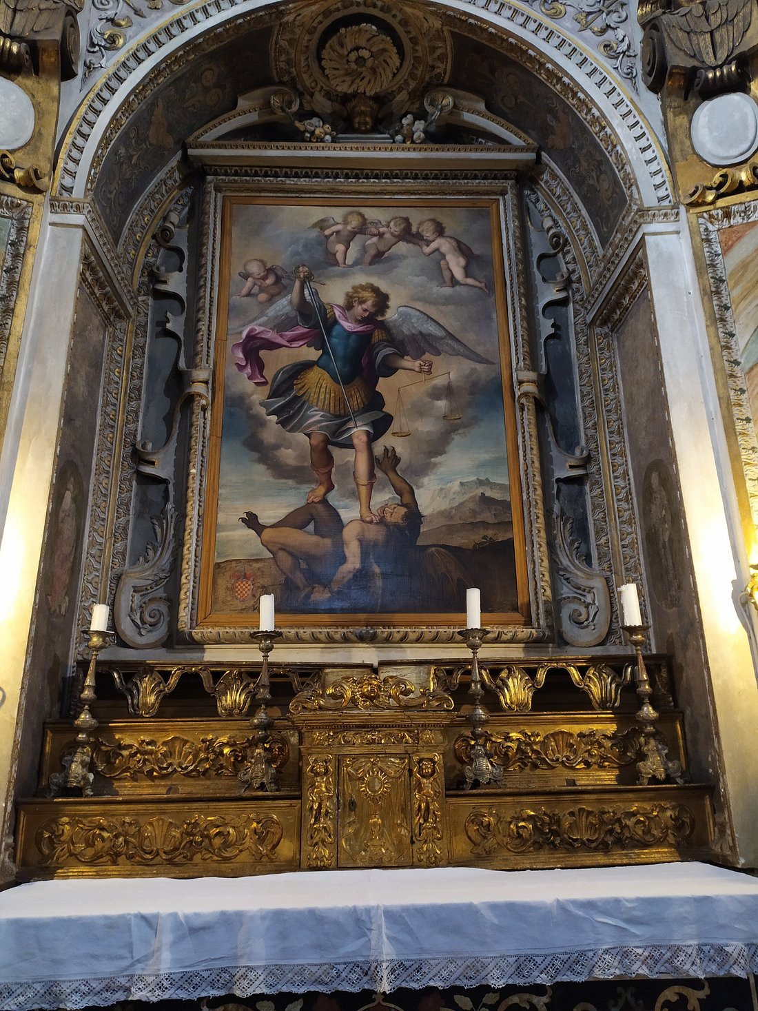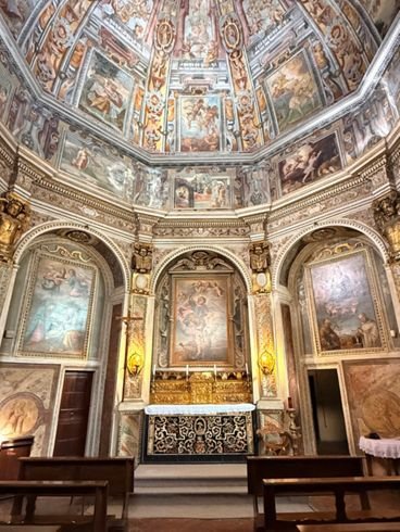 L’edificio è sormontato da una cupola completamente affrescata da Giorgio Alberini (1576 circa – 1626 circa), mentre le decorazioni della cupola sono di mano del pavese Giovanni Antonio Cassano e datano dal 1597. Raffigurano le storie dei tre arcangeli Michele, Gabriele e Raffaele e ognuna è separata dalle contigue tramite mascheroni e grottesche.