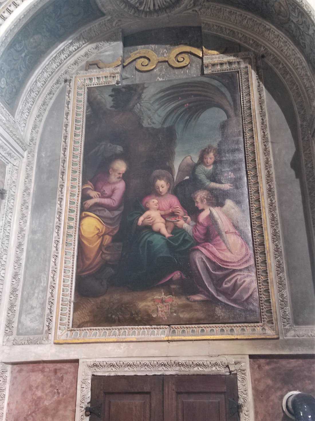 Nelle nicchie alle pareti sono presenti sei tele di Guglielmo Caccia detto il Moncalvo, datati a prima del 1614: Annunciazione, Annuncio ai pastori, Natività, San Michele Arcangelo (altar maggiore), Madonna Assunta con San Francesco e monaco certosino, Riposo in Egitto. L’ultimo quadro, Il sogno di San Giuseppe, è opera del 1627 di Guglielmo Crosio.