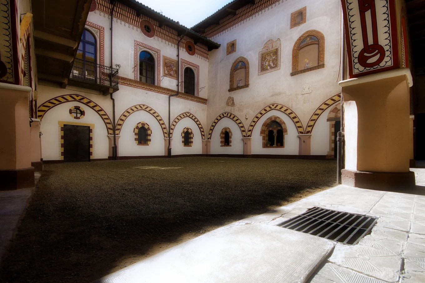 Al primo piano nell’antico salone di rappresentanza si conserva parte di un importante ciclo pittorico di cultura lombarda della metà del XV secolo, con scene di caccia, di giochi e di vita cortese.