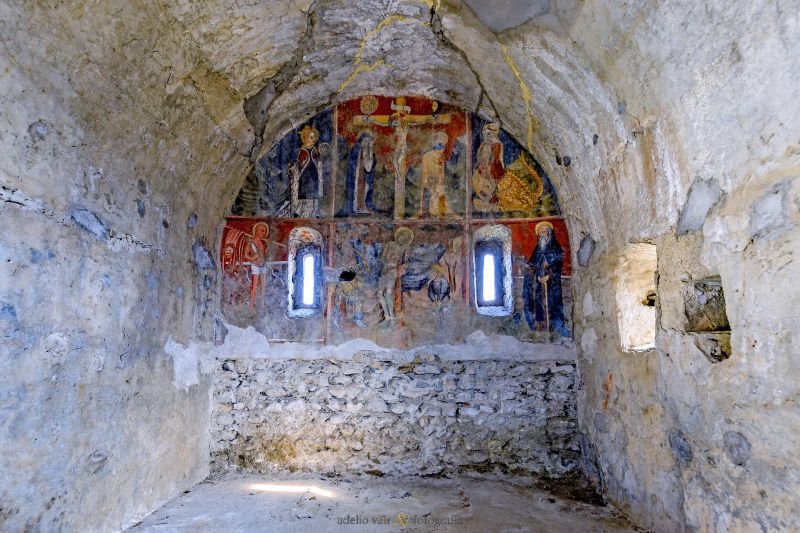 Conserva all’interno nel lato absidale affreschi del ‘400, attribuibili forse alla scuola di Giacomo Pitterio, comunque di raffinata fattura. Si distinguono sul registro superiore una Crocefissione con il Sole e la Luna, Maria e Giovanni, a sinistra Santa Caterina con la ruota del martirio, a destra Santa Margherita che esce dal ventre del Drago. Nel registro inferiore a sinistra San Bartolomeo con la propria pelle scuoiata, al centro San Sebastiano trafitto dalle frecce, a destra Sant’Antonio abate con sotto il porcellino nero.