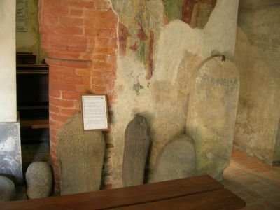 All’interno della chiesa sono conservate cinque lapidi di epoca romana, una databile al I secolo, le altre più incerte, rinvenute alcune in terreni della zona, altre nel greto del fiume Stura, piuttosto rozze, con scritte frammentarie, presumibilmente opera di scalpellini locali.