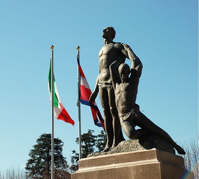La scultura presenta due figure maschili coperte solo da un velo alla vita, una in piedi che sorregge l’altra accasciata, si ispira a valori di fratellanza e pietà.