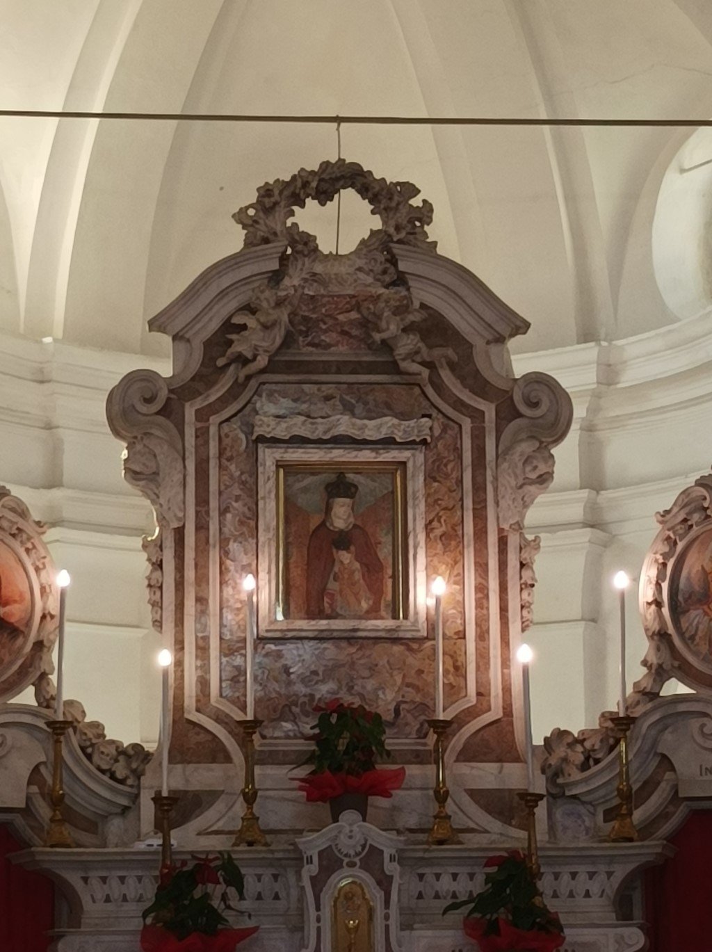 Sull’altare maggiore è il dipinto su pietra della Madonna che tiene nella mano destra un libro e con il braccio sinistro stringe al seno il Bambino nell’atto di benedire con la mano destra, mentre nella sinistra ha un globo terrestre sormontato dalla croce.