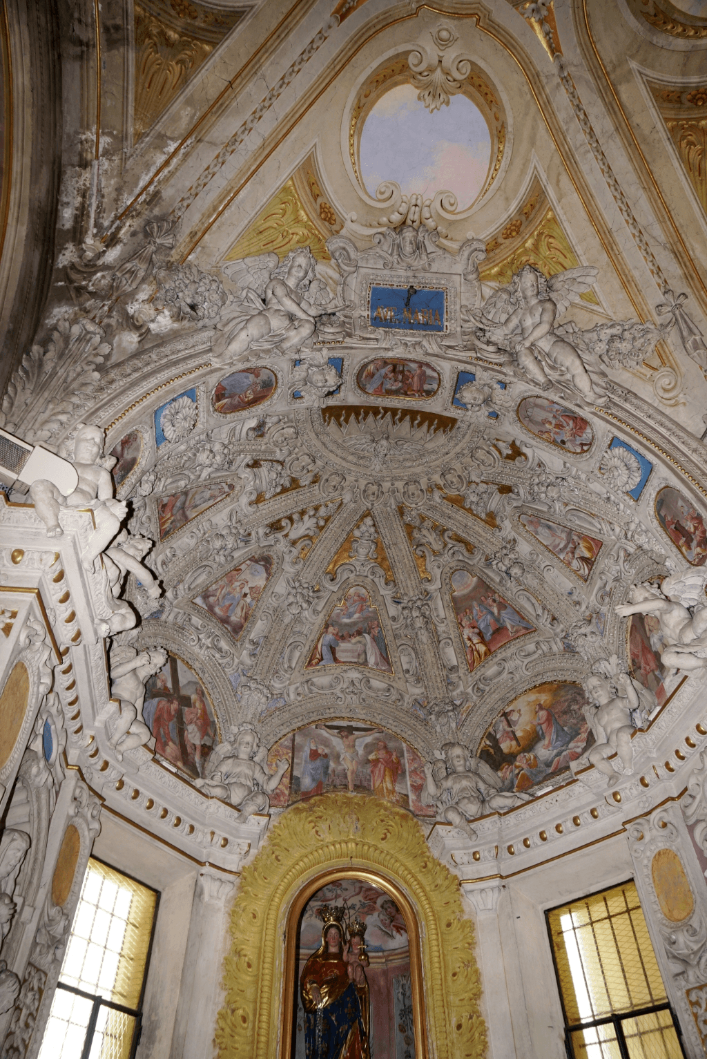 È infatti la Vergine a dominare l’ambiente dall’interno della nicchia, aperta sul fondo della cappella, dove angeli appaiono rappresentati con tenui colori. Si tratta della statua lignea della Madonna del Rosario che, come scritto nel libro dei conti della Parrocchiale, fu commissionata al Tiberino, artista aronese, e pagata nel 1630. Maestosa nel mantello dorato che copre una veste blu punteggiata a stelle auree, regge il Rosario nella mano sinistra e col braccio destro cinge il Bambino.