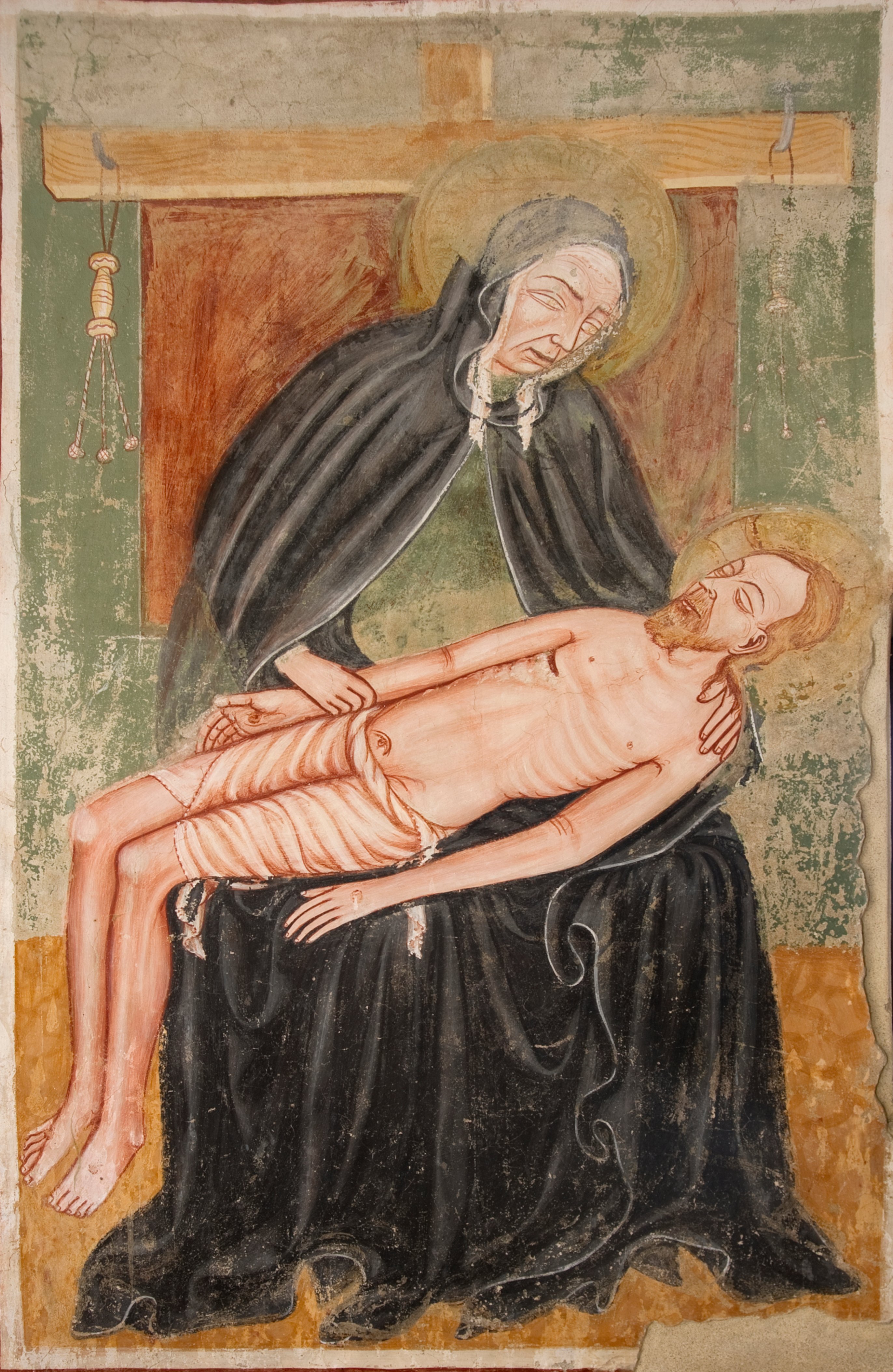 Al centro del catino absidale una struggente Pietà, Sant’Elena e una Madonna in trono con Bambino, risalenti all’inizio del Quattrocento e riconducibili, secondo la critica, al Maestro di Garbagna.
