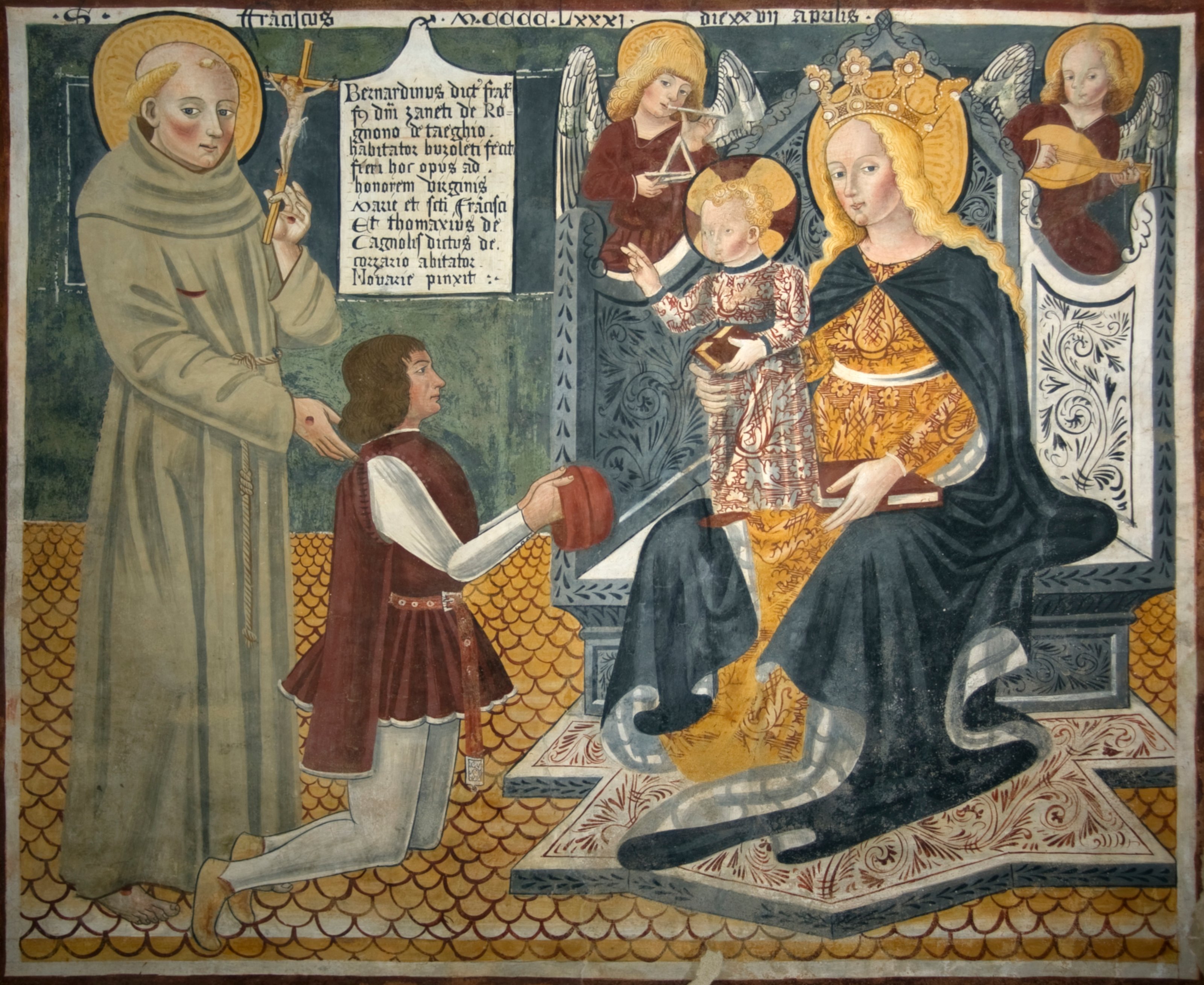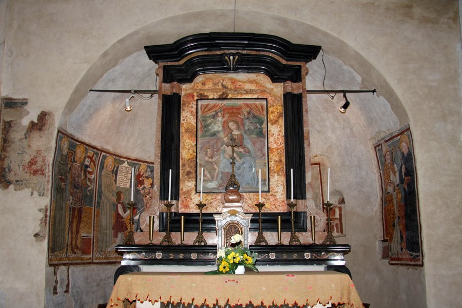 Lungo le pareti una serie di Santi e Madonne: San Grato, Madonna in trono con Bambino con iscrizione e poi ancora Santa Caterina d’Alessandria, un’altra Madonna in trono con Bambino e un bambino in preghiera con abito francescano, San Bernardo d’Aosta, San Bernardino da Siena, San Bovo, Beato Pier Lombardo e San Nicola da Tolentino.