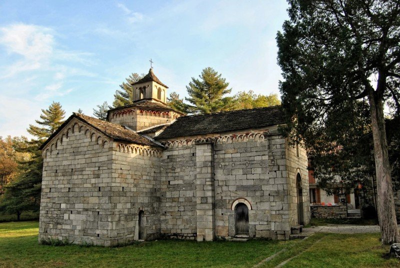 Sul lato rivolto ad est si aprono cinque monofore a doppia strombatura, due sull’abside, una su ciascun braccio del transetto ed una sul tiburio appena sopra l’abside.