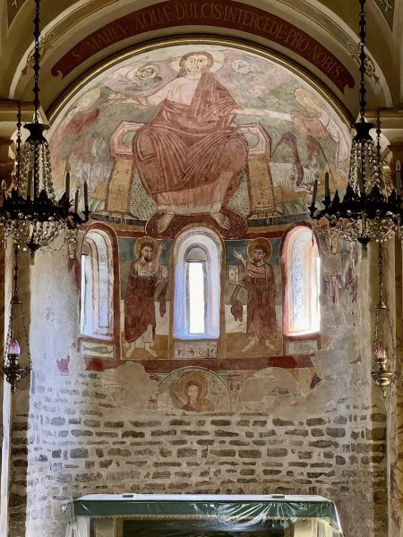 I lavori di restauro hanno inoltre portato alla luce pregiati affreschi in stile romanico-bizantino posti sul catino absidale centrale; questi sono risalenti probabilmente al XII secolo e raffigurano un Cristo in Maestà nell’atto della Traditio Legis. Alla sua destra si trova san Pietro che riceve la chiavi, alla sua sinistra san Paolo che riceve il rotolo delle Scritture. La figura di Gesù, che siede su un sontuoso seggio privo di schienale, è circondata dai simboli degli Evangelisti.