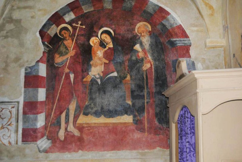 Sulla parete destra si può invece ammirare una Madonna con Bambino circondata da san Giovanni Battista e sant’Antonio abate (risalente verosimilmente al XV secolo).