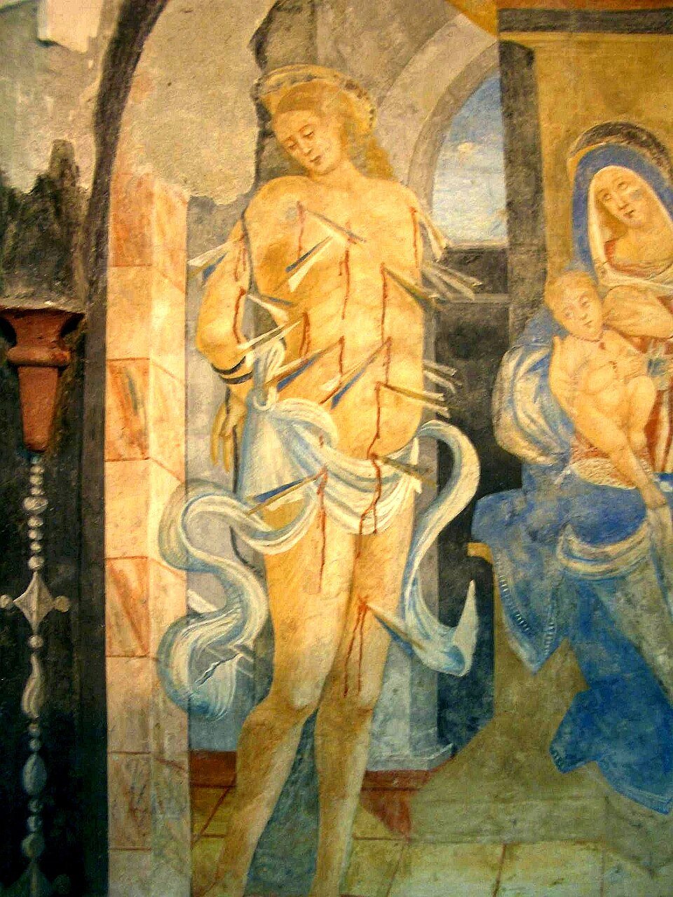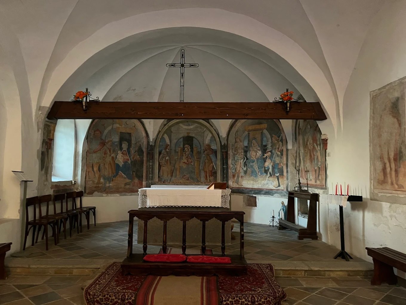 Dietro l’altare vi sono tre scene che raffigurano la Vergine col Bambino affiancata da Santi che sono affrescate in finte architetture, dipinte seguendo le regole della prospettiva. L’ignoto artista fu attento a creare l’illusione di continuità tra il nostro spazio e quello dell’affresco, come se la scena sacra si svolgesse proprio davanti allo spettatore.