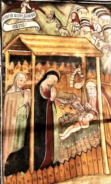 Sulle pareti laterali e sulla volta del presbiterio la vita della Madonna è illustrata in diciotto riquadri. Con continuità si susseguono gli episodi: S. Gioacchino cacciato dal tempio, l’angelo appare a Gioacchino, l’incontro di S. Anna e S. Gioacchino alla porta Aurea, la Nascita di Maria, la presentazione e la vita al Tempio, l’Annunciazione e lo Sposalizio con Giuseppe, la Nascita di Gesù, la Circoncisione, l’Adorazione dei Magi, la Fuga in Egitto, la Strage degli innocenti.