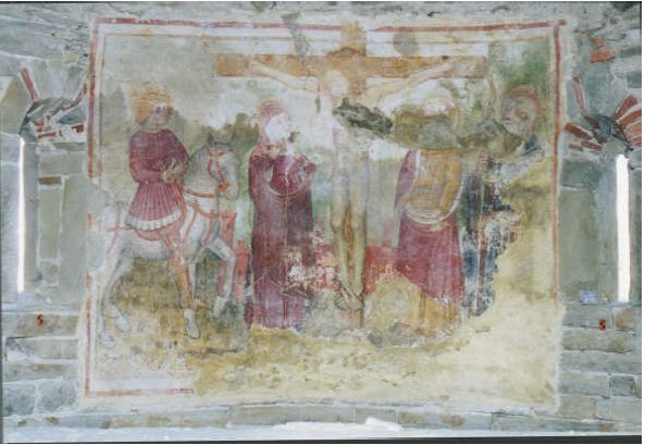 All’interno dell’abside vi è un affresco attribuito ad un Maestro Piemontese o Lombardo del 1480 circa che rappresenta Cristo Crocifisso con Madonna e una Santa, sullo sfondo le mura di Gerusalemme, ai lati s. Sant’Antonio abate e un Santo a cavallo, tradizionalmente identificato con s. Vito.