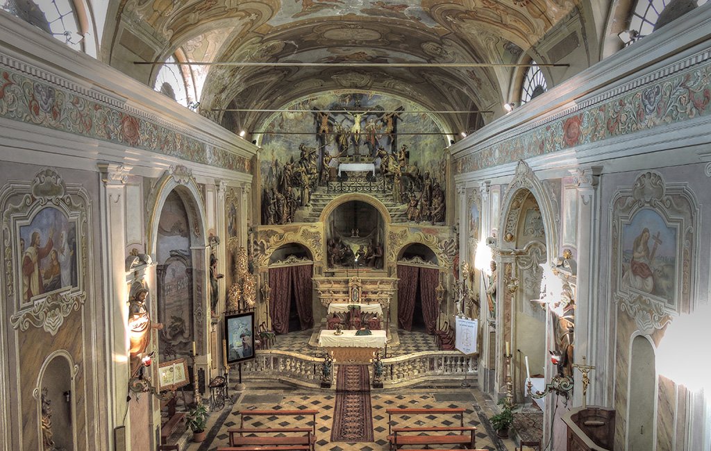 L’interno, che custodisce affreschi, tele liguri e lombarde e un organo storico, è a navata unica con coro e abside, separati dalla navata da una struttura a tre archi, quelli laterali disposti obliquamente, quello mediano, più alto, che fa da cornice all’altare maggiore ed ospita il gruppo in terracotta policroma che raffigura la Deposizione.