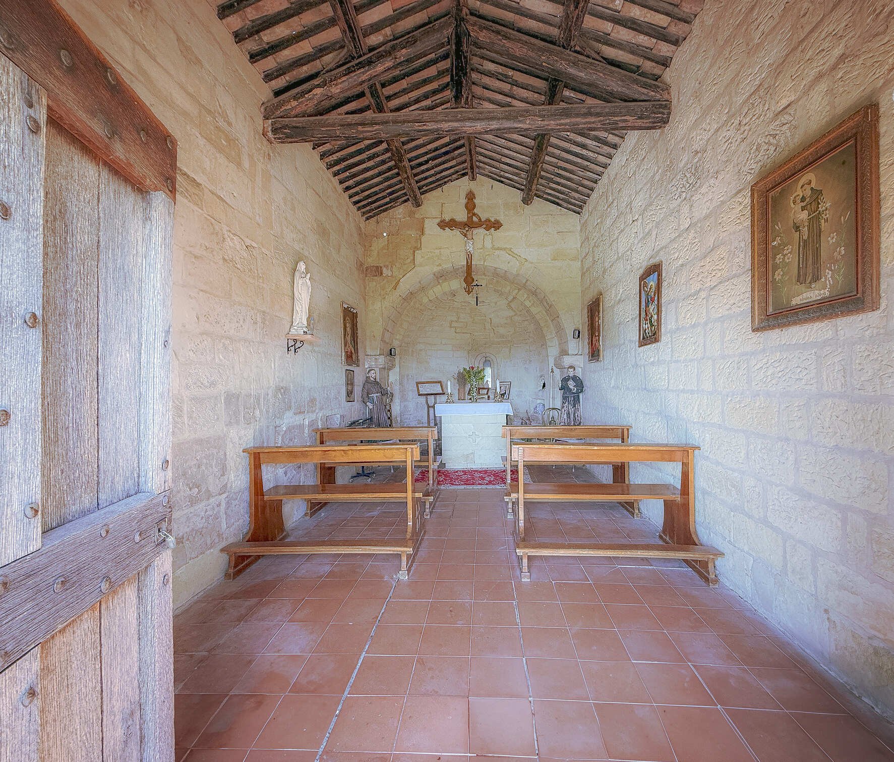 Ha un piccolo campanile a vela e l’interno è spoglio.