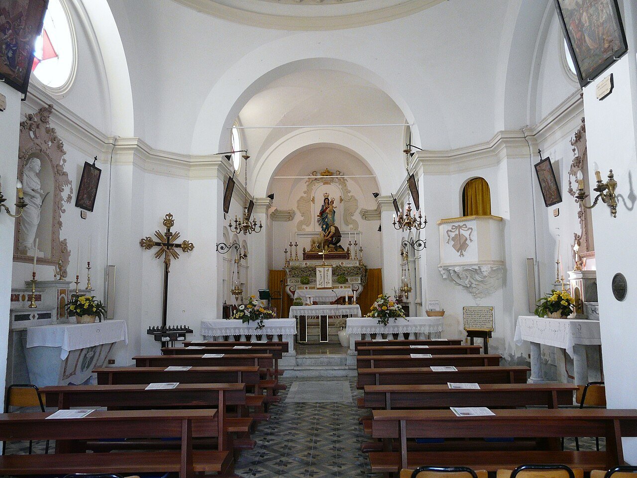 Dietro all’altare centrale è posta una statua dipinta con vivaci colori della Madonna col Bambino e ai suoi piedi un pastore inginocchiato e una pecora; alle spalle, in alto, un decoro a stucco con corona e due putti.