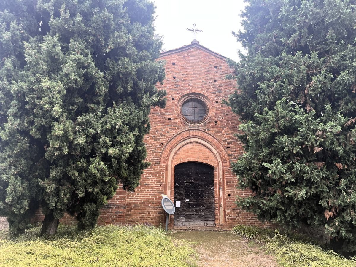 La struttura dell’edificio è realizzata in mattoni, la facciata a capanna, quasi nascosta da due grandi cipressi, presenta un portale d’accesso ad arco ribassato arricchito da una cornice in cotto ad arco ogivale ed un oculo che evidenzia lo spazio della nave centrale.