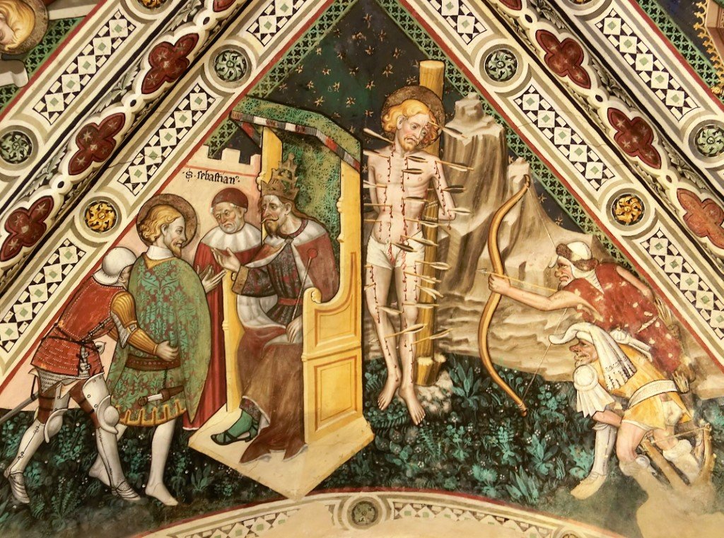 Sulla volta del presbiterio, affreschi di Guglielmetto Fantini (storie di San Sebastiano e di Sant’Antonio abate, evangelisti), pittore formatosi sugli esempi di Giacomo Jaquerio.
