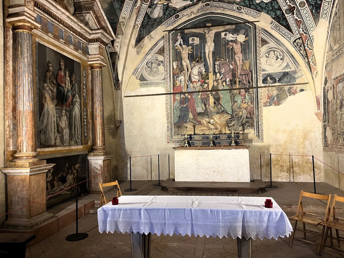Nel presbiterio, a sinistra dell’altare, Madonna col Bambino e santi (1681) sulla parete di fondo la grande Crocefissione (c. metà del sec. XV). e nella parete destra è rappresentata una ‘Ultima Cena’, deteriorata da molte scalpellinature e da alcune zone prive ormai dell’affresco. La scena viene presentata attorno ad un tavolo circolare e in uno spazio molto limitato.