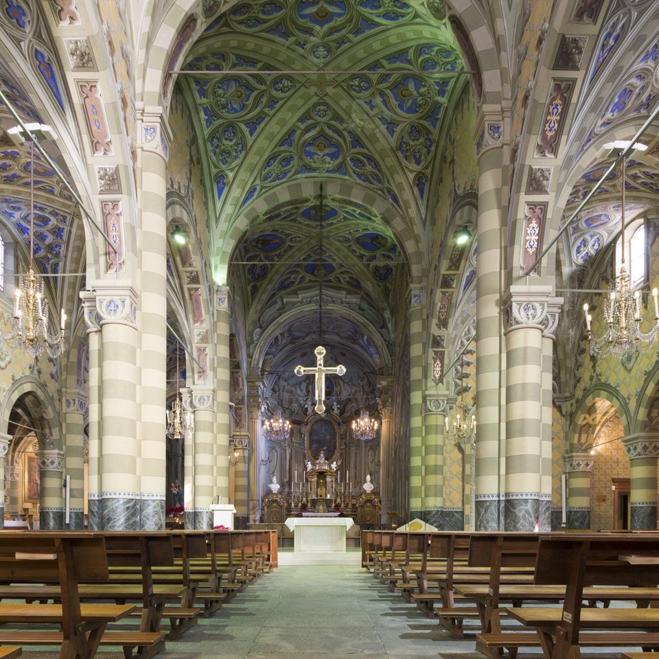 La chiesa è intitolata a San Maurizio comandante della legione Tebea nota per la fede e diligenza all’esercito romano. Durante il regno di Massimiano, III secolo, la legione fu inviata in Gallia per reprimere una rivolta. I soldati eseguirono brillantemente la loro missione, tuttavia in seguito, quando Massimiano ordinò di perseguitare e uccidere alcune popolazioni locali del Vallese convertite al cristianesimo, molti tra i soldati tebani si rifiutarono affermando di essere sia soldati dell’imperatore che servi di Dio. Per punizione, l’Imperatore ordinò la decimazione della legione.