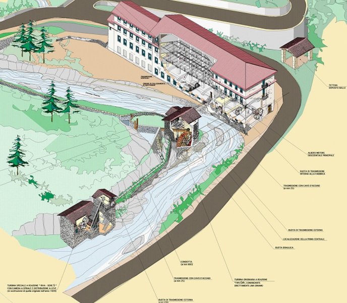 La “Fabbrica della ruota”, unico caso conosciuto in Italia, conserva ancora integro il sistema di trasmissione “telodinamico”, teorizzato anche da Galileo Ferraris. L’acqua del torrente Ponzone veniva opportunamente incanalata e condotta alla cabina che ospitava la turbina. Il salto d’acqua imprimeva al rotore il movimento che veniva “trasportato” per ottanta metri alla grande ruota della fabbrica mediante un cavo d’acciaio. Il volano in lega metallica a sua volta metteva in moto un albero di trasmissione orizzontale principale al quale erano connessi altri due alberi ai piani superiori. Il movimento così distribuito raggiungeva i macchinari tramite pulegge e cinghie.