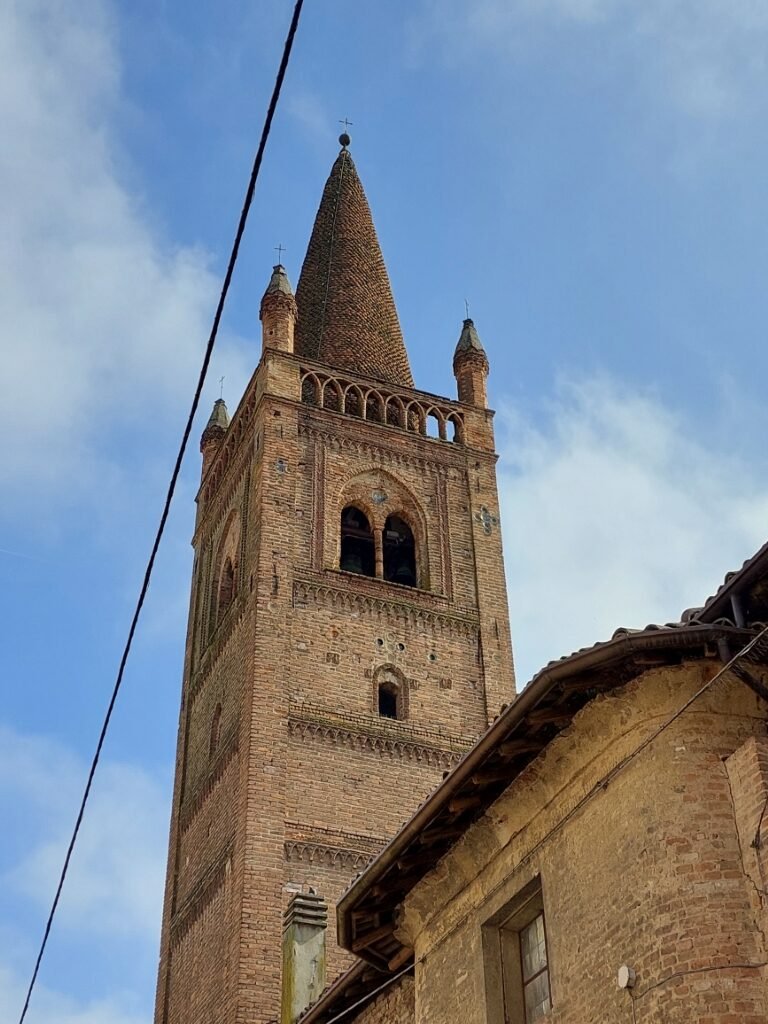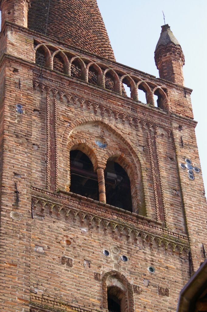 Il Campanile. Pochi anni dopo l’edificazione della chiesa, fu costruito sul fianco sinistro in prossimità dell’abside, il notevole campanile, di bella struttura gotica a cuspide con la partitura muraria arricchita dall’inserimento di bacini ceramici.