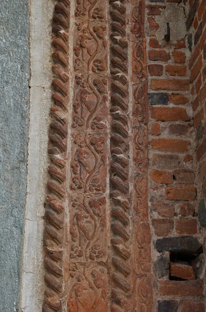 La pianta è a tre navate, con abside poligonale i cui angoli sono segnati da contrafforti. La facciata è a gradini, esempio unico nel Biellese; sul lato destro però lo spazio fra un gradino e l’altro è stato riempito, ottenendo un unico spiovente. Si vede però bene il profilo dei gradini originari, perché la muratura è diversa. Da questa parte inoltre, facciata e chiesa sono state allargate e l’asimmetria è vistosissima. La porta, che in origine doveva essere ogivale, è incorniciata da un fregio rettangolare di terracotta con figure di Bacco e grappoli d’uva, quattro-cinquecenteschi. Il protiro addossato alla facciata è sproporzionato e i fianchi della chiesa hanno ora un aspetto irregolare per l’apertura di varie cappelle laterali. La decorazione consisteva in due fregi di archetti a tutto sesto incrociati, uno lungo la navata e uno lungo le navatelle, sormontati da corsi di mattoni a dente di sega che si è conservata in due lunghi tratti sul lato sinistro.