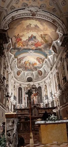 L’impianto planimetrico è a tre navate suddivise da quattro pilastri polilobati per parte decorati a finto marmo e termina con abside semicircolare e composte da quattro campate con volte a vela. Il presbiterio originario a pianta quadrangolare si raccorda all’abside semicircolare, un’alta cornice decorata da stucchi e ovali dipinti delimita le scene figurate delle volte di questi due ambienti – botte lunettata e catino semicircolare –dando l’impressione di un unico spazio decorato.