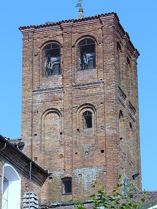 L’imponente campanile, di impianto medievale, forse coevo alla torre paleologa eretta nel 1410-13, si eleva in mattoni a vista sul fianco sinistro, lievemente arretrato rispetto alla facciata. Presenta una pianta quadrata con lato di 6 m e presenta quattro registri suddivisi in due campiture su cui si aprono monofore, alcune tamponate interamente o parzialmente.