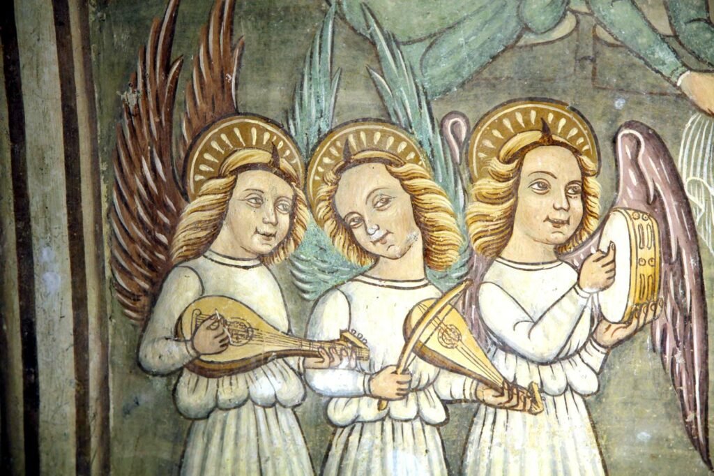 L’arco di trionfo ogivale si armonizza poco con la curvatura della volta, si può ipotizzare possa essere stato modificato per accogliere nell’abside un affresco di modeste dimensioni attribuito al maestro di Roccaverano, artista che operò nella zona nella seconda metà o fine del ‘400. L’affresco raffigura l’Assunzione della Vergine tra Angeli; ai piedi è disteso il Bambino attorniato da Angeli musicanti che suonano il liuto, la ribeca, il tamburello, la cennamella, la bombarda e la zampogna. Ai lati della Vergine, due Angeli vessilliferi suonano due trombe.