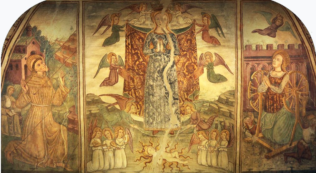 A sinistra è la figura di san Francesco che riceve le stimmate; a destra di santa Caterina d’Alessandria con la ruota del martirio.