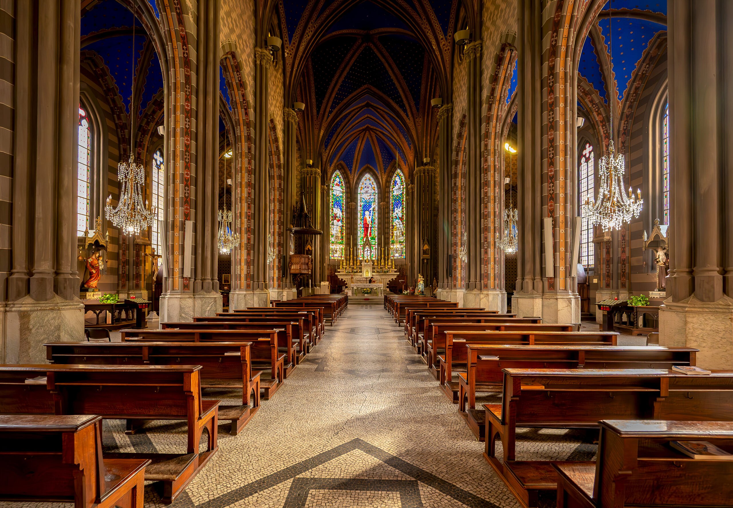L’interno, con pianta a croce latina, ha tre navate suddivise da alti colonnati. In fondo alla navata di destra, a destra dell’abside, fu ancora ricavato lo spazio per una Cappella, dedicata a Nostra Signora di Lourdes. In fondo alla navata sinistra invece, vi è l’accesso alla sacrestia e gli uffici; Giuseppe Albertoni fu autore delle due sculture interne, raffiguranti i due coniugi Falletti, che furono poste sopra gli ingressi della sacrestia e della Cappella di Lourdes.