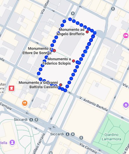 In Piazza Arbarello, rivolto verso via Fabro, si trova la statua del generale, eseguita da Giuseppe Dini (1820-1890) nel 1883. Inaugurata nello stesso anno in Piazza Solferino, l’opera fu trasferita, nel 1923, nell’allora giardino della Cittadella.