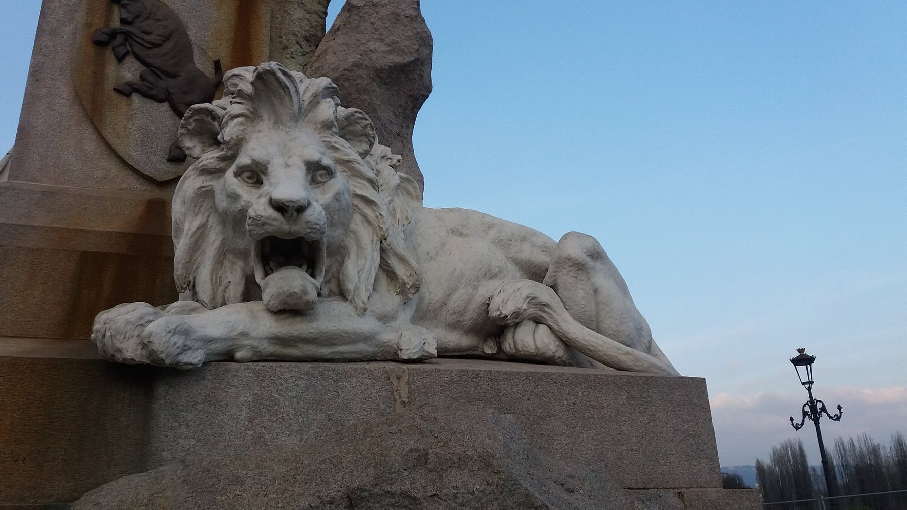 Sul basamento si possono vedere le statue in pietra, a destra, di un leone, simbolo della forza del popolo (anche lo stesso Garibaldi fu definito “il leone di Caprera”) e, sull’altro lato, di una figura femminile che tiene una bandiera, allegoria dell’Italia.