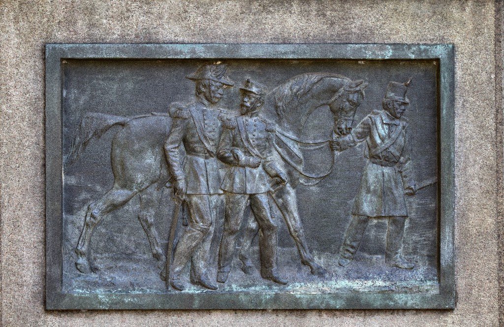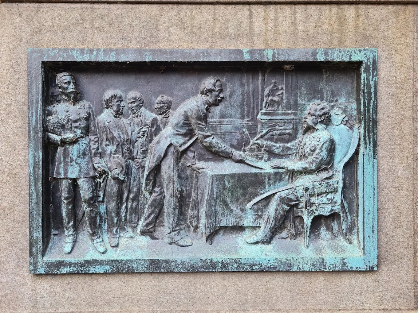 Ai lati del basamento, due bassorilievi bronzei: uno lo raffigura ferito nella battaglia di Vicenza nel 1848 durante la prima guerra d’indipendenza e l’altro mentre sottopone al Re per la firma il Proclama di Moncalieri nel 1849.