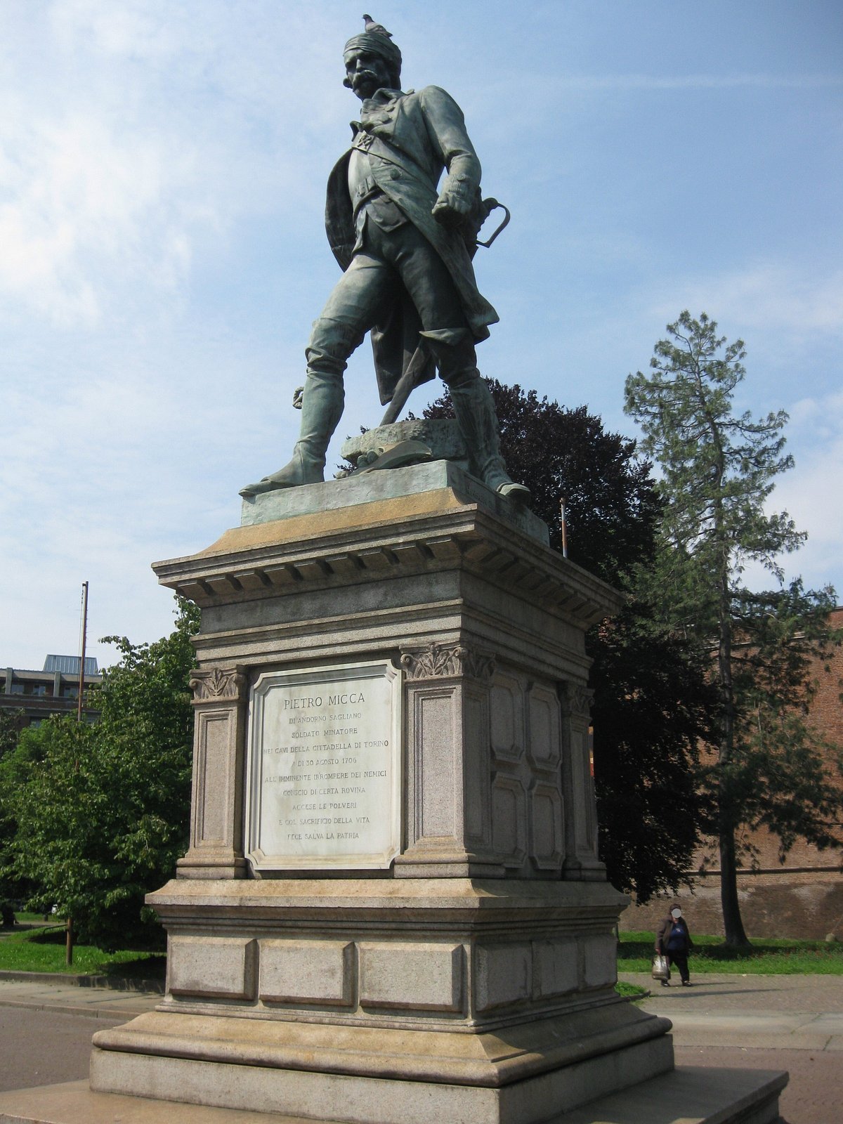 La statua ritrae Pietro Micca (1677-1706) in divisa da artigliere, nell’atto di sacrificare la vita per la salvezza di Torino durante l’assedio del 1706.