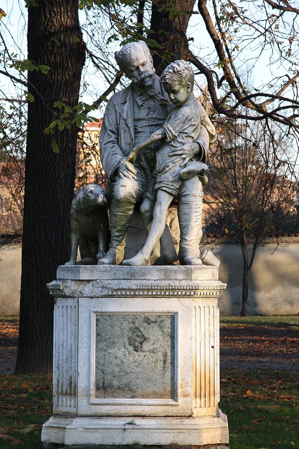 La scultura ritrae Vittorio Emanuele II (1820-1878) mentre, seduto su una roccia, in abbigliamento venatorio, abbraccia un bambino scalzo; accanto vi è un cane.