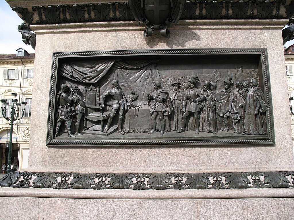 L’artista realizzò il monumento equestre e due bassorilievi da porre sul basamento raffiguranti la “Battaglia di San Quintino” (1557) e il “Trattato di Cateau-Cambrésis” (1559).
