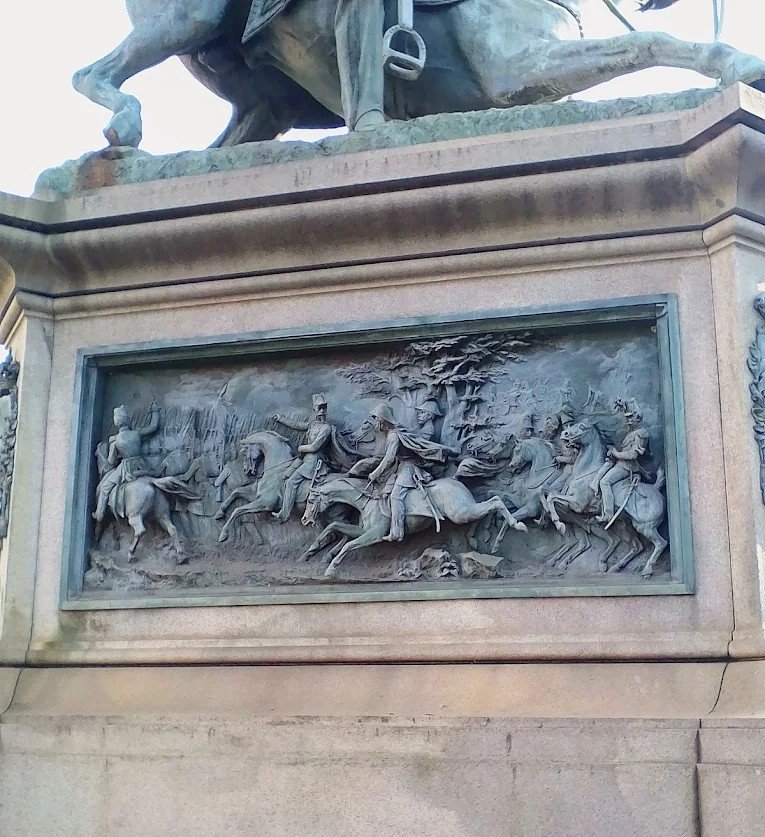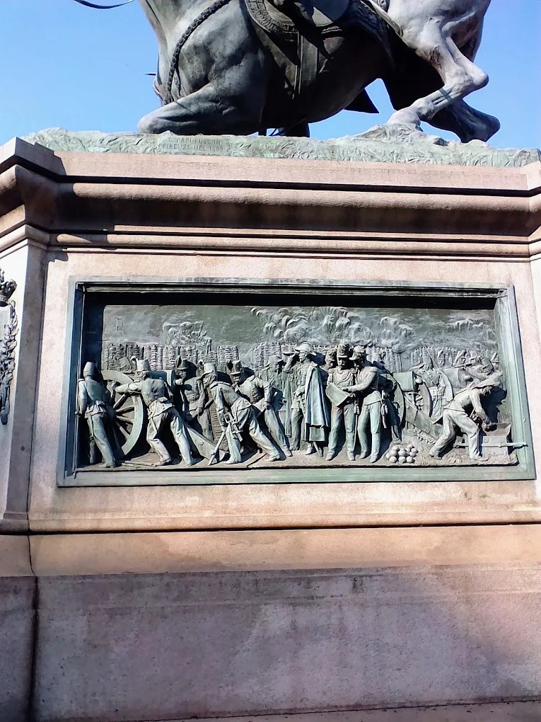 Questa è la scena che nel 1866 raffigurò Alfonso Balzico (1825-1901). la statua è posta su un basamento con due bassorilievi che raffigurano scene della battaglia.