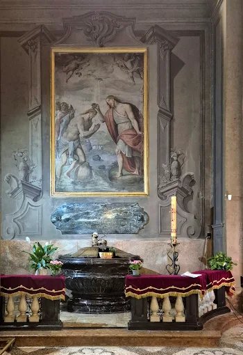 Nella navata sinistra sono il battistero in marmo (sec. XVIII), l’affresco, del Battesimo di Gesù di Gian Mauro della Rovere detto il Fiammenghino, una tela di Aurelio Luini (XVI secolo) raffigurante una Madonna fra San Rocco e San Sebastiano e l’altare dedicato alla Madonna del buon consiglio di scuola ligure che è il più antico presente nella chiesa ed era in origine dedicato a San Marziano patrono della diocesi.
