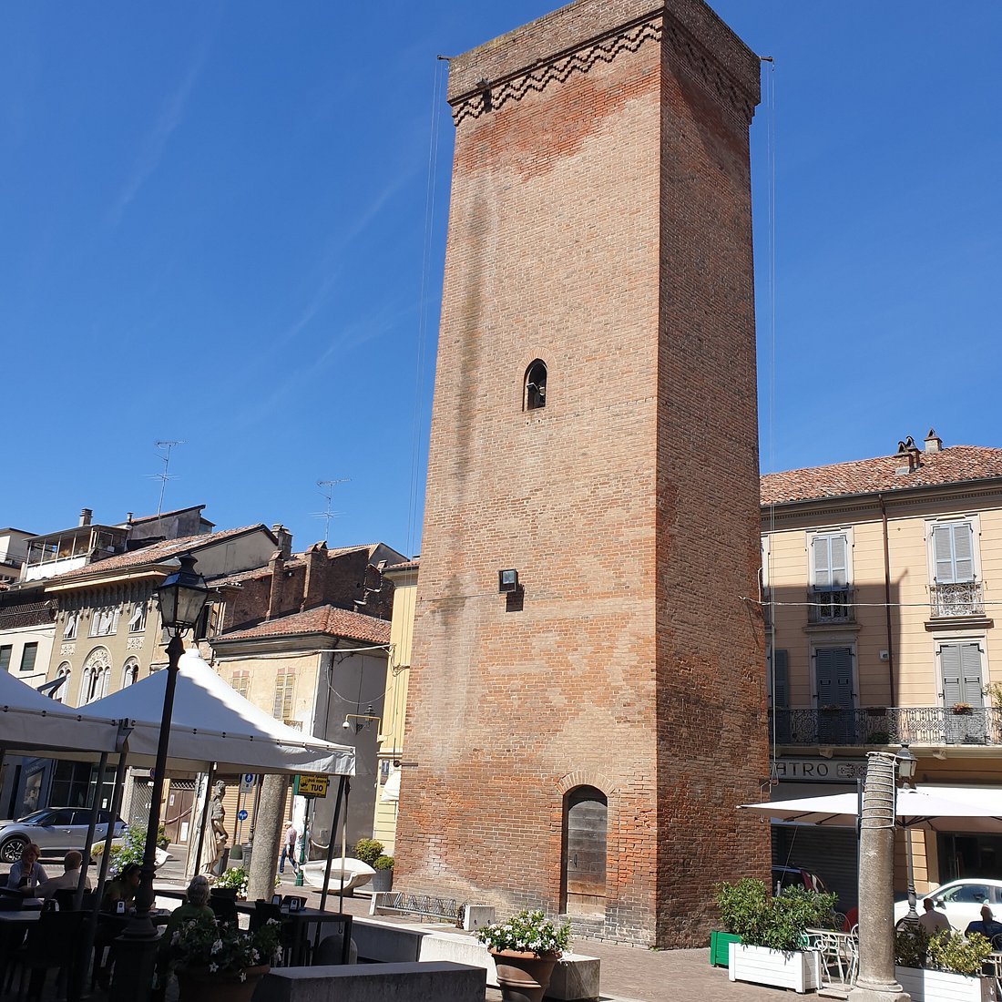 La torre che si erge sulla piazza di fronte al Palazzo Guidobono conserva nel basamento porzioni di muratura medievale, in gran parte ricostruita nel 1939-42 (non confondere con la torre situata sulla sommità del colle che sovrasta Tortona e che è l’unica testimonianza rimasta della possente fortezza sabauda di San Vittorio).