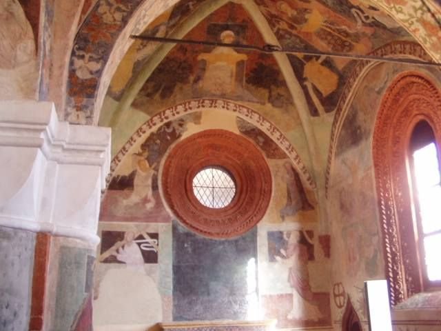Gli affreschi esterni, esposti alle intemperie ed agli inquinanti, andarono perduti, tranne uno che, in occasione di uno degli ampliamenti, venne incorporato nella cosiddetta “Sacrestia Nuova” ed è ancora oggi visibile in tutto il suo splendore. Degli altri rimangono le copie che il D’Andrade provvide a collocare all’esterno della Chiesa del Borgo Medioevale di Torino.