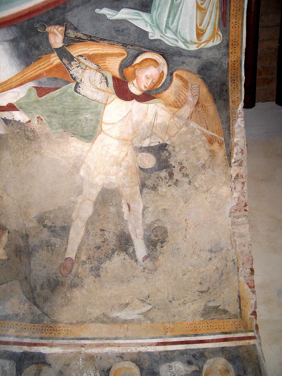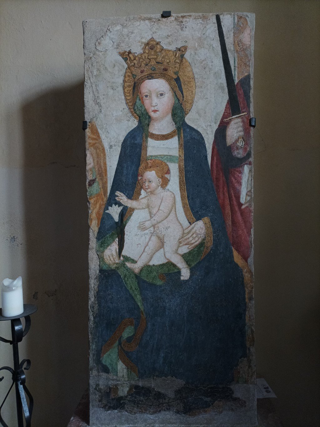 Al fondo della navata destra è stata collocata una bella Madonna col Bambino, frammento di un affresco dello stesso periodo.