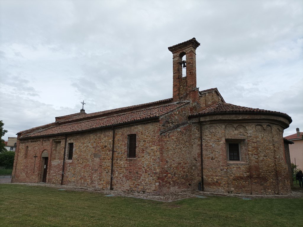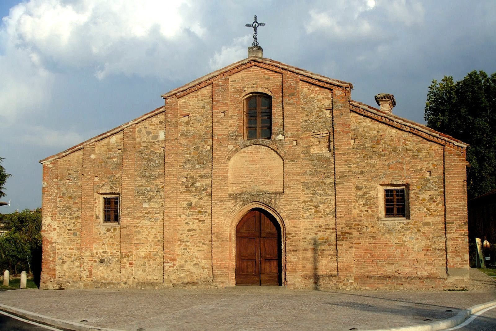 L’edificio ha una struttura in mattoni e ciottoli di fiume. La facciata è a salienti; l’altezza delle navate laterali era in origine assai più bassa e fu innalzata nella ricostruzione del XV secolo. Sulla facciata si trova un semplice portale ogivato e decorazioni a lesene disposte asimmetricamente. Scomparse le originarie absidiole che chiudevano le navate laterali, è rimasta solo l’abside maggiore, ornata da lesene con archetti pensili.